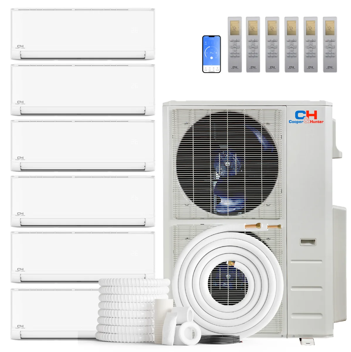 Cooper & Hunter Olivia Series 6-Zone Ductless Mini Split AC & Heat Pump -- 48000 BTU (4.0 Ton), Wall Mount Units (9K+9K+9K+12K+12K+12K) BTU, Inverter Technology, 230V, Heating & Cooling - R454B