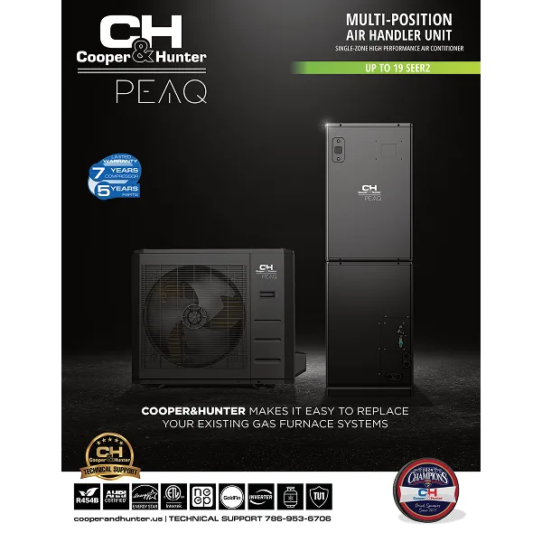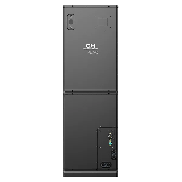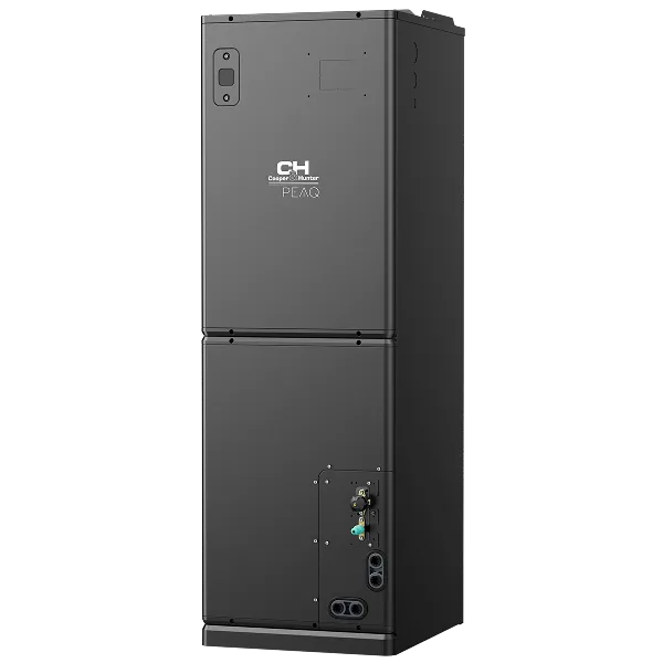 The New 36K Btu PEAQ Multi-Voltage Air Handler by Cooper&Hunter is the most recent revolutionary HVAC solution designed to elevate your home climate control experience. Utilizing the new R454B refrigerant, this slim indoor unit, with a width of 17.5", matches most gas furnaces, making it an ideal replacement for your existing system. The PEAQ unit is a single-zone, high-performance air conditioner that offers both horizontal and vertical installation options for maximum flexibility. Its adaptive multi-voltage capability (115V & 208-230V) automatically identifies the required voltage without manual conversion, eliminating the hassle of rewiring. With a SEER2 rating of up to 17.7, the 36K PEAQ unit ensures exceptional energy efficiency. The innovative M-COIL design delivers less than 0.02 in. W.C. pressure drop, providing a mere 2% airflow difference between evaporators. Constructed with TU1 copper tubes, this unit boasts excellent electrical and thermal conductivity, along with superior corrosion and cold resistance. The symmetric fan blower design ensures even airflow and higher efficiency heat exchange. For added comfort, an auxiliary heater can be purchased separately, available in 5kW, 10kW, 15kW, and 20kW models. Additional features include refrigerant leak sensors, a factory-installed drain pan heater to prevent ice accumulation, and an ultra-efficient discharge fan that guarantees uniform heat exchange and prevents frost on the compressor's coils. A detachable delay fuse protects the wire set from outdoor to indoor, preventing overcurrent and ensuring safety. Control Options include: Built-in Smart Kit with Downloadable C&H App, included Remote Control and Wall Thermostat.
